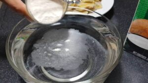2.นำผงวุ้นลงผสมในน้ำเปล่า แช่ทิ้งไว้ 10-15 นาที เพื่อให้ผงวุ้นอิ่มตั ว