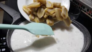 6.ใส่เนื้ อ มะพร้าวอ่อน+กล้วยที่เตรียมไว้ลงไป รอให้เดื อ ดอีกครั้ง