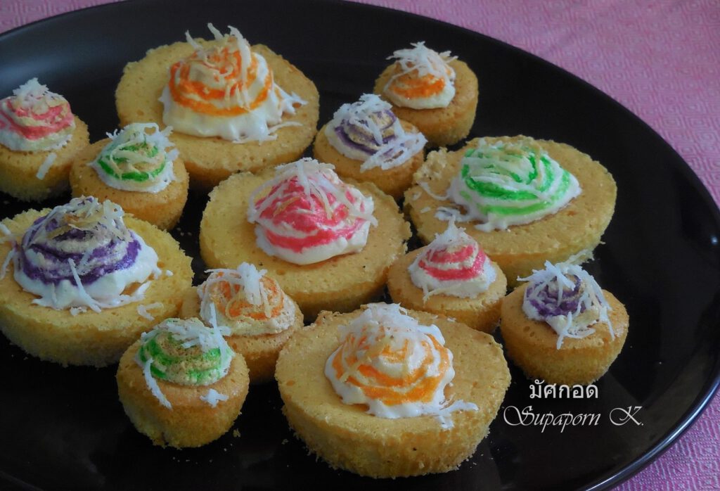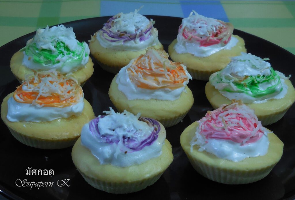 – ตักครีมด้วยช้อนเล็ก โดยใช้ช้อน 2 อัน ตักกลับไปมา ให้เป็นก้อนกลมๆ แล้ววางลงบนหน้าขนม ใช้ไม้ชุบสี เขียนลายวนเหมือนก้นหอย นำไปอบ(ไฟบน) 5 นาที แล้วใส่มะพร้าว อบต่ออีกประมาณ 5 นาที พักให้ขนมอุ่นๆ แล้วแคะออกจากพิมพ์