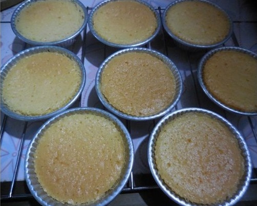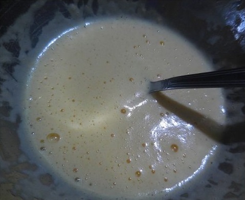 – ตีไข่และน้ำตาลให้ขึ้นฟู ทยอยใส่แป้งลงไป คนให้เข้ากัน (อย่าคนแรงเพราะขนมจะไม่ฟู)