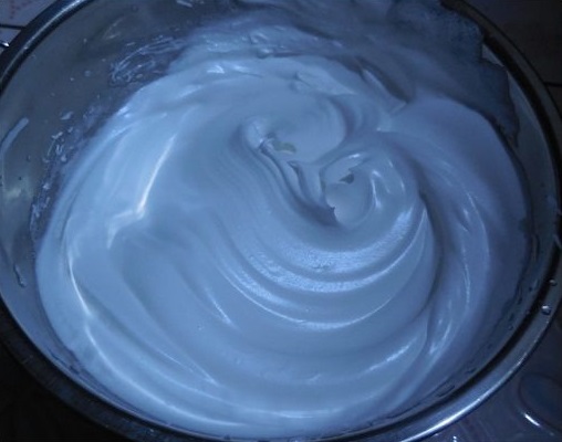 – ตีไข่ขาวให้ขึ้นฟู ใส่น้ำมะนาวลงไป ตีให้เข้ากัน แล้วทยอยใส่น้ำตาลลงไป ตีให้ตั้งยอด และขึ้นเงา