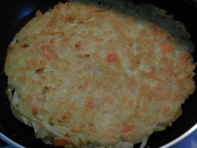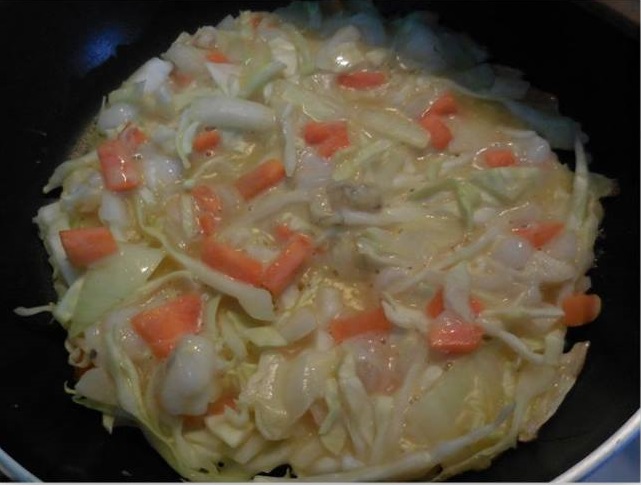 – นำไข่ แป้ง น้ำสะอาด คนผสมให้เข้ากันดี ใส่กะหล่ำปลี กุ้ง แครอท หอมหัวใหญ่ ลงไปคนให้เข้ากัน