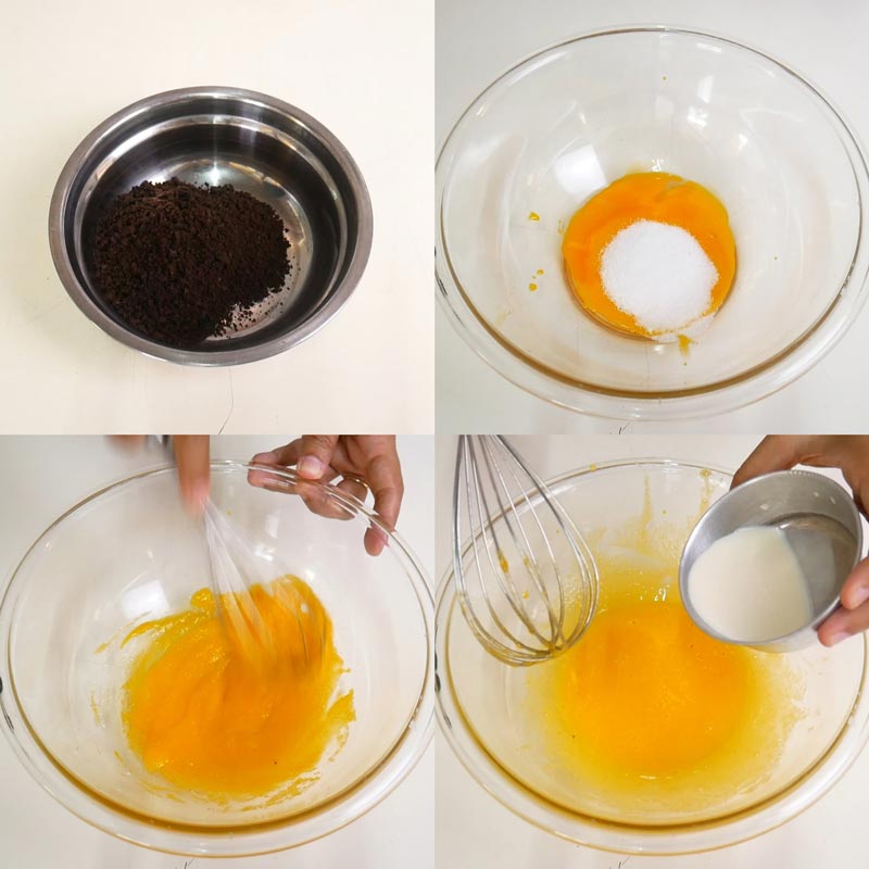 2. ทำส่วนผสมไข่แดง โดยนำไข่แดงกับน้ำตาลทรายใส่ลงชามผสม คนให้เข้ากัน ใส่นมสด คนให้เข้ากัน