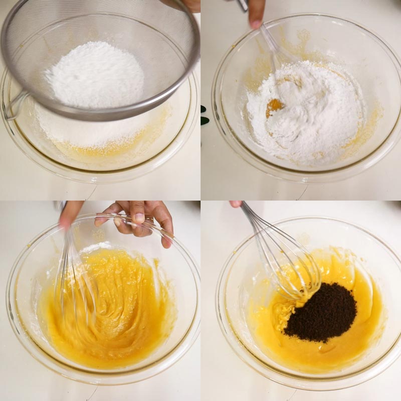 5. ร่อนแป้งกับผงฟูลงชามผสม แล้วตะล่อมให้ส่วนผสมเข้ากันดี