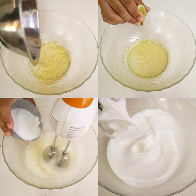 7. ทำส่วนผสมไข่ขาว โดยนำไข่ขาวใส่ลงในชามหรือโถตี ใส่น้ำมะนาว ตีจนขึ้นฟองหยาบ ทยอยใส่น้ำตาลทราย สลับกับการตี ทยอยใส่จนน้ำตาลทรายหมด และตีต่อจนตั้งยอดอ่อน