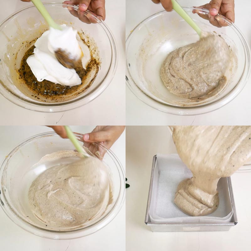 8. ทยอยตักส่วนผสมไข่ขาวใส่ลงในชามผสมของไข่แดง แล้วตะล่อมให้เข้ากัน