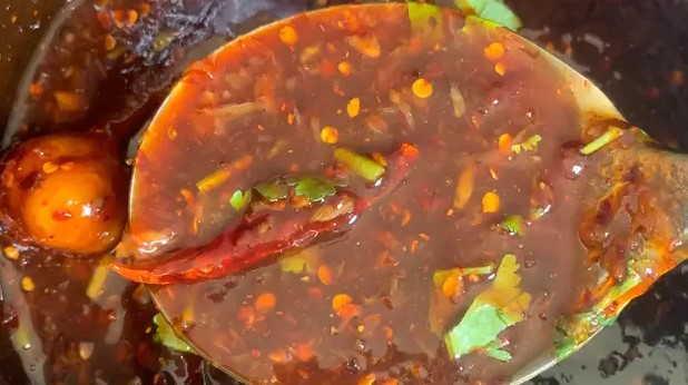 8 เมื่อใส่ทุกอย่ างแล้วให้เรานำพริกที่เราตำมานั้นใส่ลงไปในหม้อหรือใครจะใช้วิธีการปั่นพริกก็ได้ ใส่พริกไปจำนวนที่เราต้องการให้เผ็ดมากเผ็ดน้อย