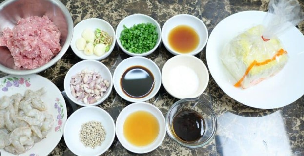 ห มู บดแช่เย็น / กุ้งสดหั่นชิ้น / ไข่ไก่ / ต้นหอมซอย / น้ำมันห อ ย / น้ำตาลทราย / เกลือ / ซุปผงปรุงรส / หอมหัวใหญ่ / แห้ว / แครอทหั่นเต๋าเล็ก / แป้งข้าวโพดหรือแป้งมัน / พริกไ ท ยป่น / น้ำมันงา / แผ่นเกี๊ยว / เ ห ล้ า จี น / ผักชี (เอาราก)
