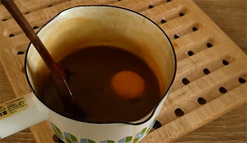 -เมื่อพักไว้ให้เย็นแล้วจะหนืดเป็นยางมะตูม ถ้าใช้น้ำตาลทรายขาวทำน้ำเชื่อมแนะนำให้ใส่ใบเตยลงไปต้มด้วยจะได้หอม หลังจากน้ำเชื่อมเย็นแล้วให้ใส่ไข่แดงลงไป คนให้เข้ากัน