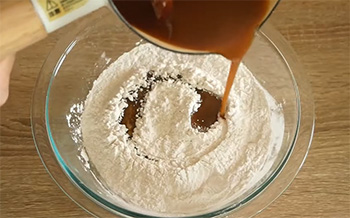 -เทน้ำเชื่อมลงในแป้ง ค่อย ๆ แบ่งเทประมาณ 3 รอบ