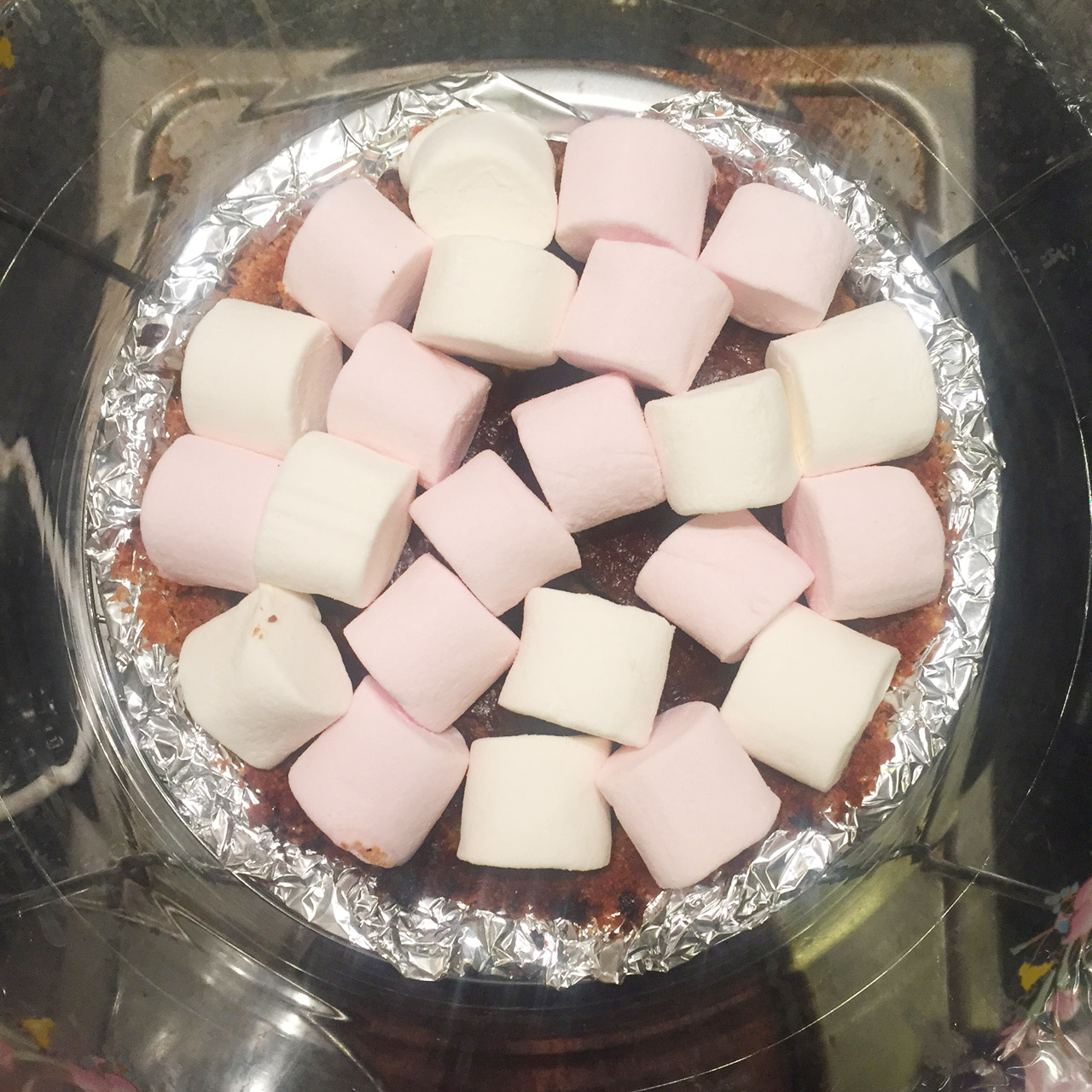 3. นำเข้าหม้ออบลมร้อน อบประมาณ 20 นาที นำมาร์ชเมลโล่วางเรียงด้านบนของขนม