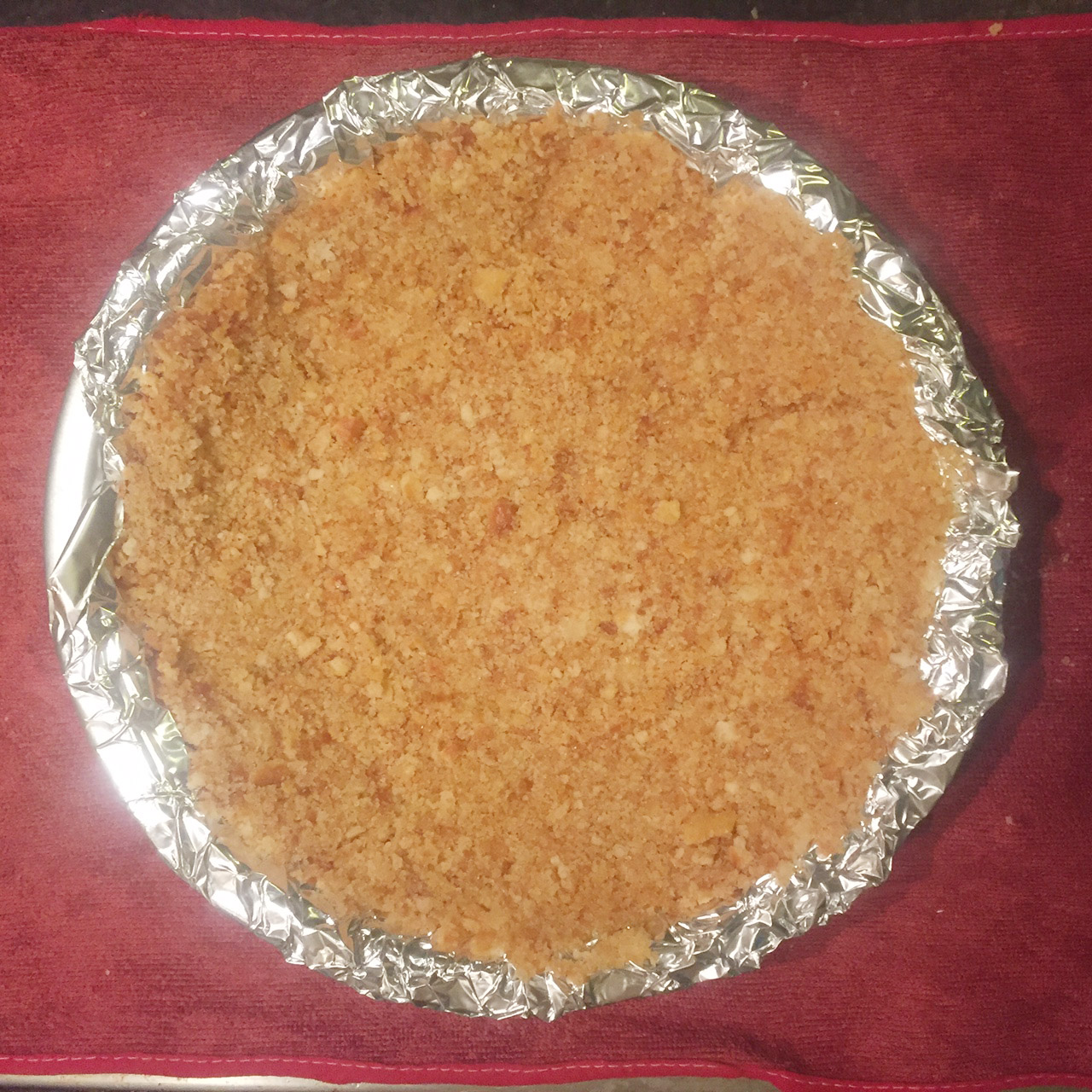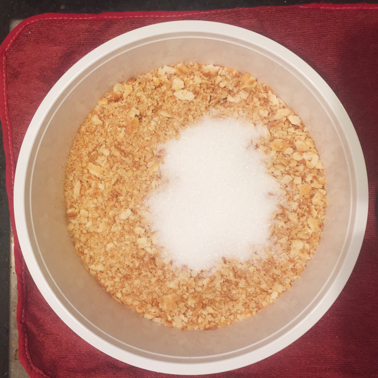 1. บดแครกเกอร์ให้ละเอียด และละลายเนยแล้วนำไปผสมกับแครกเกอร์บด ใส่น้ำตาลทรายลงไป คลุกเคล้าให้เข้ากัน เสร็จแล้วก็เอามากดอัดลงในถาดที่เตรียมไว้