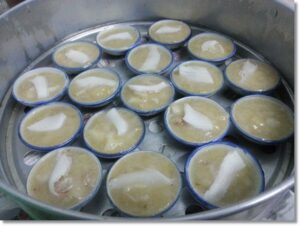 4.โรยมะพร้าวเส้น นึ่งน้ำเ ดื อ ด ใส่ถ้วยตะไลนึ่ง 15-18 นาที /นึ่งใส่ถาด 35- 40 นาที