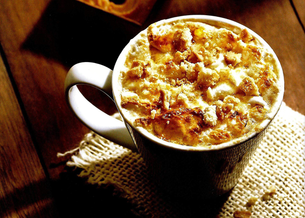 2. เติมนมร้อน ใส่มาร์ชแมลโลว์ลงไปในแก้วกาแฟ นำเข้าไมโครเวฟประมาณ 1 นาที (หรือจนมาร์ชแมลโลว์ละลาย) นำออกมาโรยด้านบนด้วยคุกกี้
