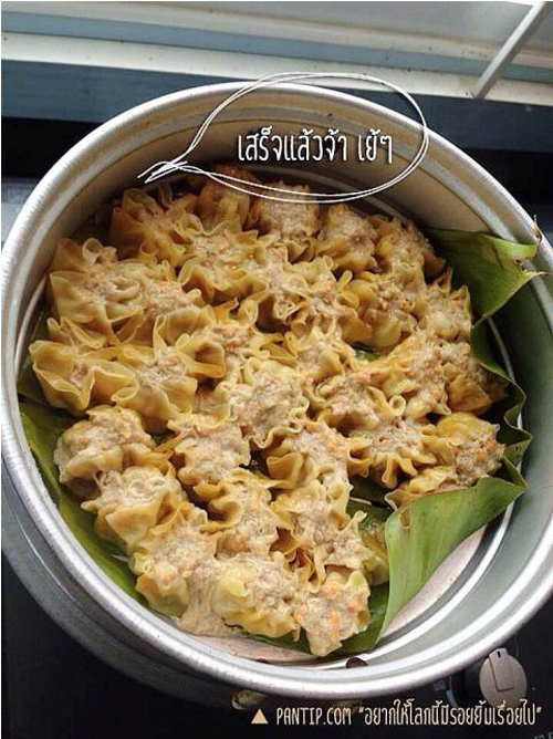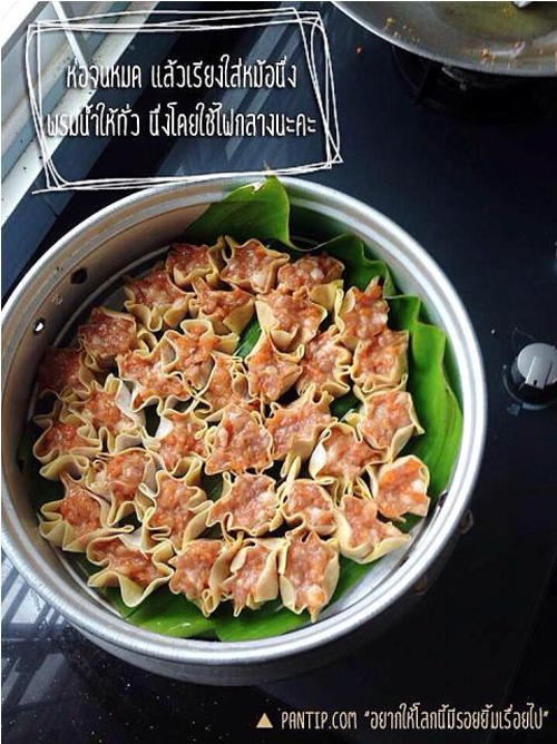• วางขนมจีบลงในหม้อนึ่ง พรมน้ำให้ทั่ว นำไปนึ่ง ใช้ไฟปานกลางจนสุก
