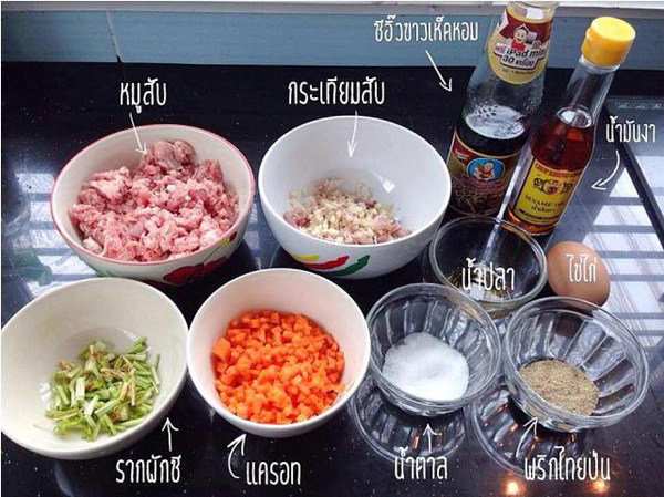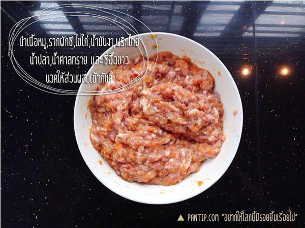 • นวดผสมหมูสับกับรากผักชีโขลก ไข่ไก่ น้ำมันงา พริกไทยป่น น้ำปลา น้ำตาลทราย และซีอิ๊วขาวเห็ดหอม ให้เข้ากันดี เตรียมไว้