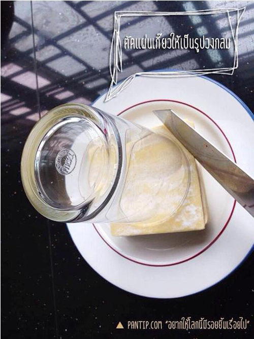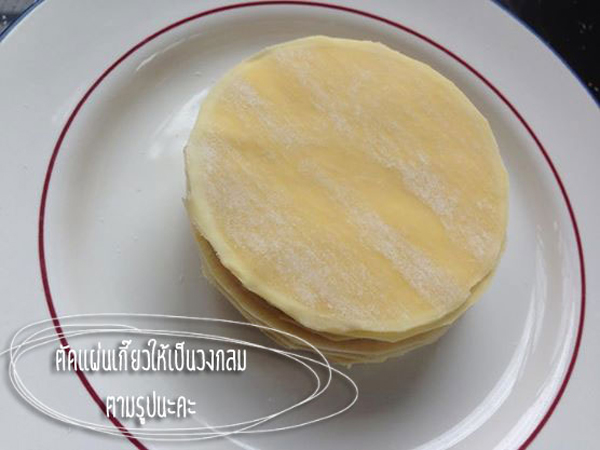 • ตัดแผ่นเกี๊ยวเป็นแผ่นวงกลม เตรียมไว้
