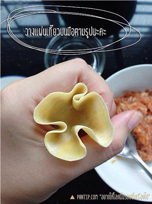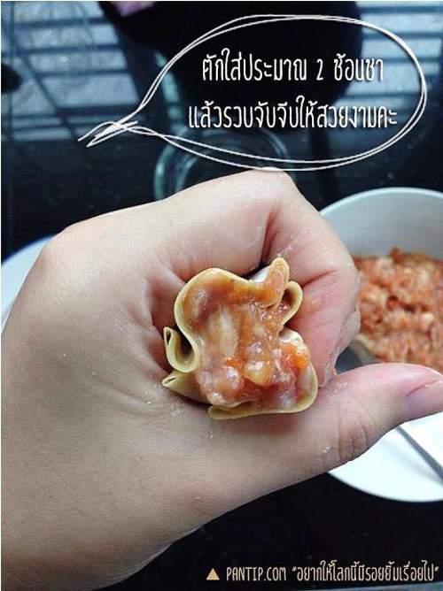 • ตักส่วนผสมหมูใส่ประมาณ 2 ช้อนชา รวบจับจีบให้สวยงาม ทำจนหมด