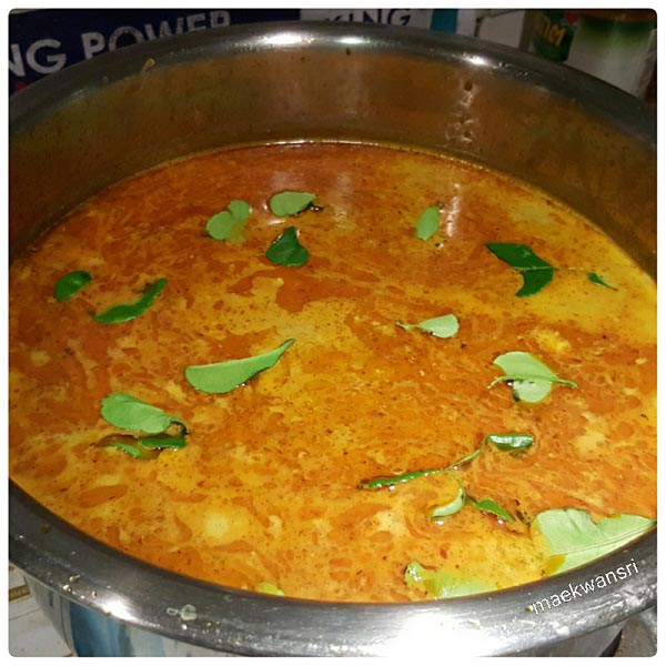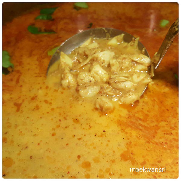2. ใส่หางกะทิลงไปคนให้เข้ากัน ปรุงรสเค็มหวานตามชอบ ใส่ส้มแขกลงไปจะทำให้มีรสเปรี้ยวเล็กน้อย ปล่อยให้เดือด