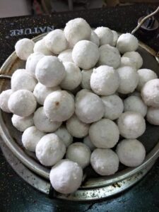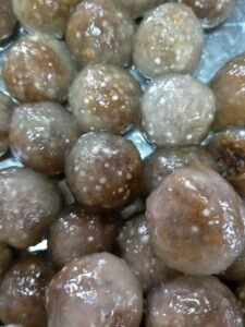 ช่วงที่เอาขึ้นมาสะเด็ดน้ำต้องรีบเอามาคลุกน้ำมั นมะพร้าวที่บ้านจะใช้น้ำมั นมะพร้าวคลุกสาคูไ ส้หมูทุกลูกเพื่อไม่ให้