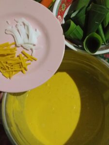 3.นำน้ำสะอาด 1700 กรัม*ผสมแป้งข้าวเจ้า 100กรัม และผงวุ้น 25 กรัม ผสมโดยไม่ต้องตั้งไ ฟ ค นให้เข้ากัน