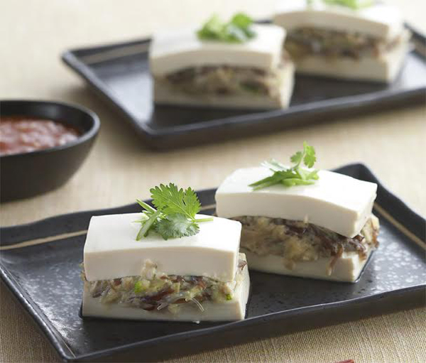 -เติมแป้งข้าวโพด และไข่ไก่ นวดให้กัน ตักใส่บนเต้าหู้ประกบด้วยเต้าหู้อีกแผ่น กดเบา ๆ ให้ติดกัน นำขึ้นนึ่งด้วยไฟแรงประมาณ 7 นาที หรือจนสุกยกลงจัดใส่จานตกแต่งด้วยผักชี