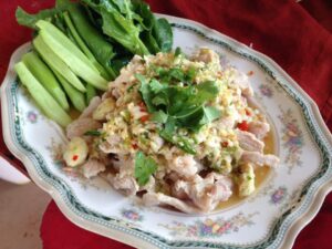ลงบนหมูที่เตรียมไว้ โรยด้วยกระเที ย มฝาน ใบสะระแหน่ และพริกแห้งทอดกรอบ พร้อมรับประทาน
