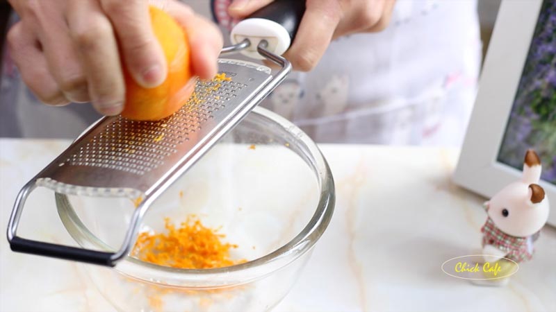 ◆ นำส้มไปล้างน้ำ เช็ดให้แห้ง แล้วนำมาขูดเอาผิวส้ม ใส่อ่างเล็ก เตรียมไว้
