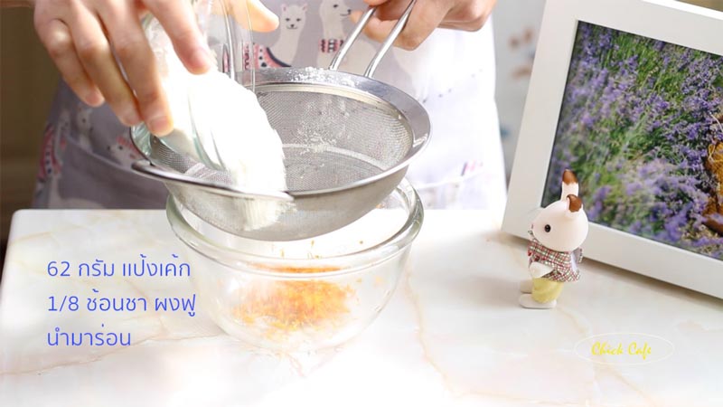 ◆ ร่อนแป้งเค้กกับผงฟูลงในอ่างที่ใส่ผิวส้มขูดรอไว้แล้ว