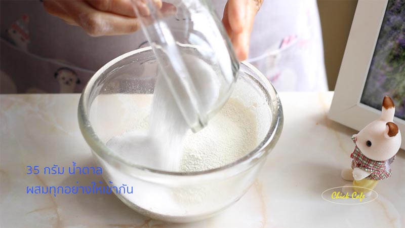 ◆ ใส่น้ำตาลทรายลงไป แล้วผสมให้เข้ากัน