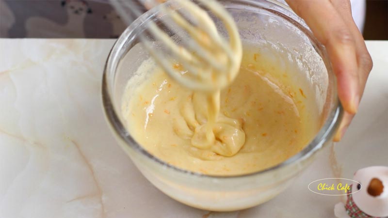 ◆ นำไข่ไก่มาตีพอแตก ใส่ลงไปในอ่างแป้ง เติมน้ำมันพืช และน้ำส้มผสมน้ำเปล่า แล้วตีผสมแป้งให้เข้ากัน อย่าให้มีก้อนแป้งเหลืออยู่