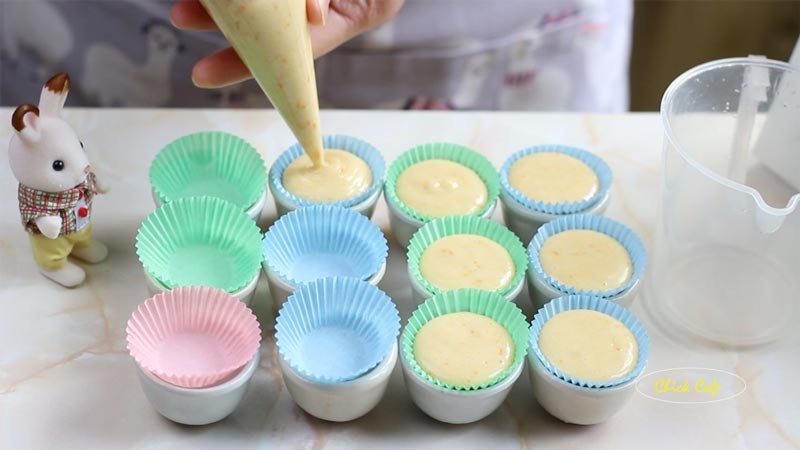 ◆ นำแป้งมาใส่ถุงบีบ แล้วบีบใส่ถ้วยเค้กที่มีถ้วยกระดาษรองอบไว้แล้ว