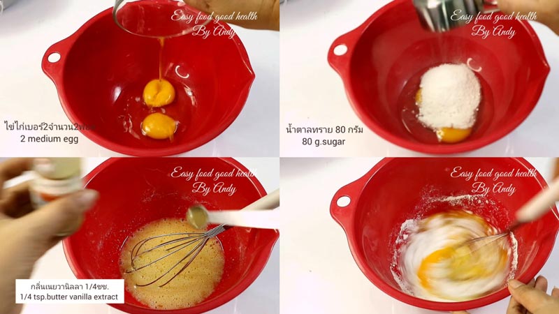 ◆ ใส่น้ำตาลทราย ไข่ไก่ และกลิ่นเนยวานิลลา ลงในอ่างผสม ใช้ตะกร้อมือตีจนน้ำตาลทรายละลาย