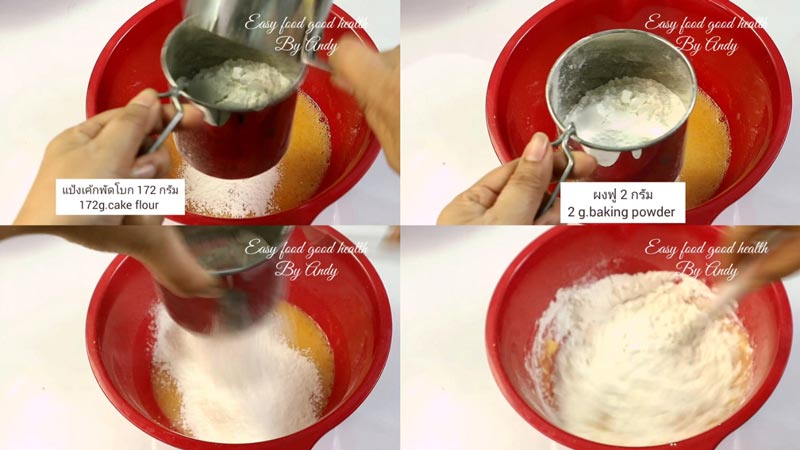 ◆ ร่อนแป้ง ผงฟู และเบกกิ้งโซดา ลงไปผสม คนจนแป้งละลาย