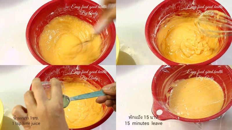 ◆ เติมน้ำมะนาวลงไป คนให้เข้ากัน พักแป้งไว้ 15 นาที ระหว่างพักให้วอร์มเตาอบไว้ 15 นาที