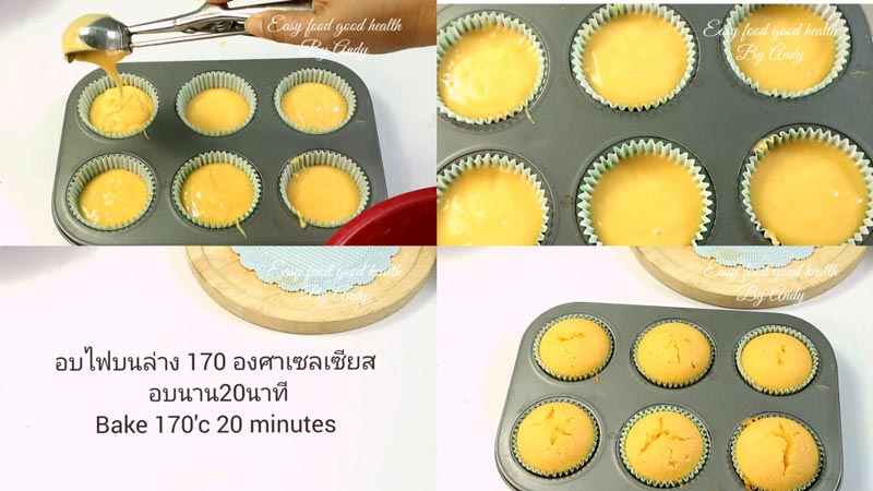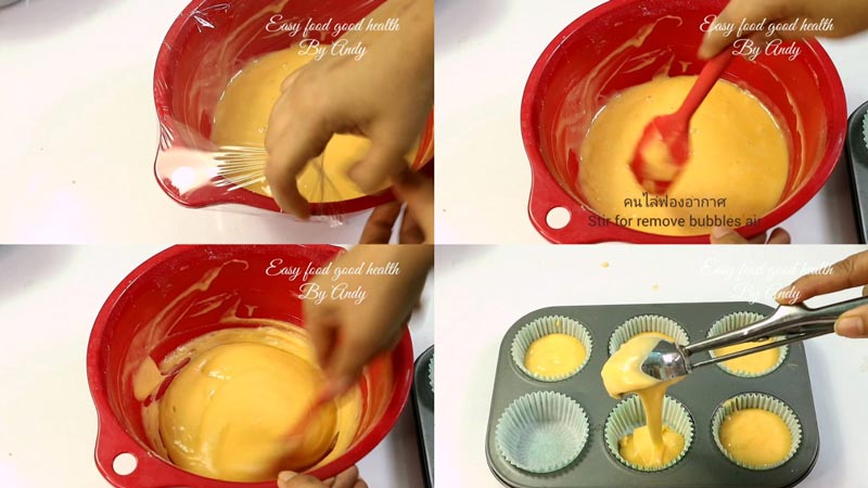 ◆ เมื่อพักแป้งครบตามเวลา คนไล่ฟองอากาศ ตักใส่พิมพ์มัฟฟินขนาด 6 ชิ้น