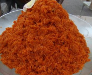 3.ใส่กุ้งและมะพร้าวขูดลงไปผัดจนสุก เติมสีผ สมอาหารสีส้มลงไปเล็กน้อย (พอให้สีสวย) ผัดให้เข้ากัน