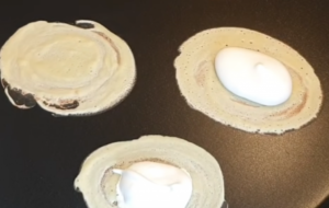 2.ใช้กระจ่าตักส่วนผ สมครีมทาลงบนแป้ง รอจนครีมร้อนจะเป็นฟองอากาศ