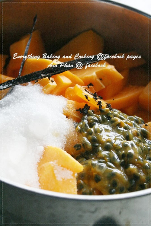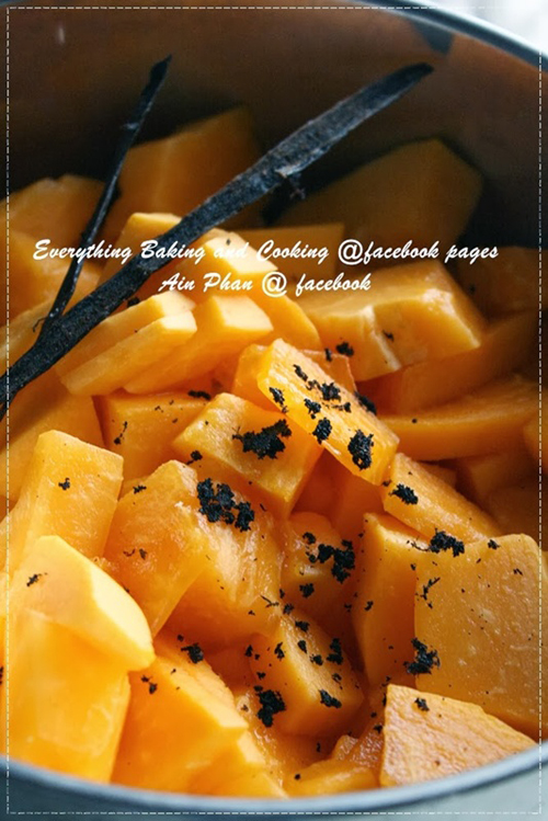 ► ปอกเปลือกมะละกอแล้วหั่นเป็นชิ้นใส่ลงในหม้อที่จะใช้กวน ตามด้วยฝักวานิลลาที่ขูดเม็ด (ใส่ฝักลงไปด้วยค่อยตักออกทีหลัง)
