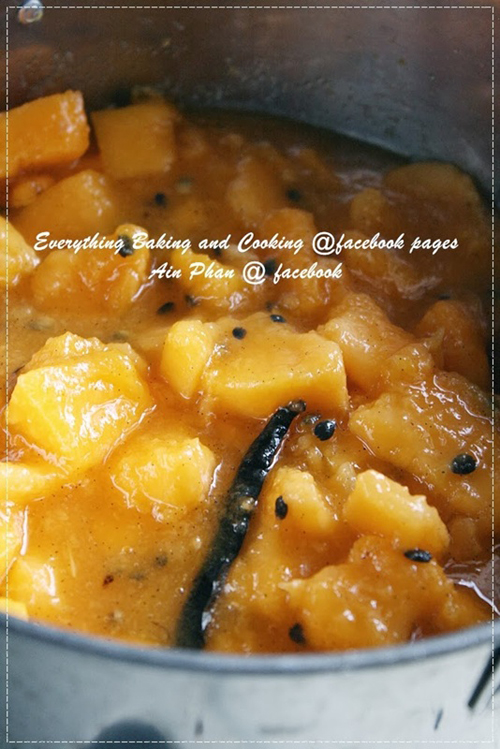 ► นำขึ้นตั้งไฟปานกลางจนเริ่มเดือด ค่อย ๆ ใช้ช้อนไม้บดเนื้อมะละกอให้ละเอียด (หรือใครจะใช้เครื่องบดอาหารช่วยก็ได้นะคะ แต่เราใช้ช้อนไม้กด ๆ บี้ ๆไปเรื่อย ๆ ก็ละเอียดอย่างไวแล้วค่ะ) เคี่ยวไปเรื่อย ๆ แล้วลดเป็นไฟอ่อน (หมั่นคนระวังก้นหม้อจะไหม้ด้วยค่ะ)