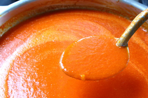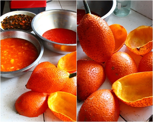 • เทรวมกันแล้วนำไปปั่นเลยครับ ใช้เครื่องปั่นอะไรก็ได้ เพราะเนื้อฟักข้าวจากผลสุกเขาค่อนข้างเละอยู่แล้ว เราอาจจะนวดก่อนที่จะคว้านก็ได้ครับ จากนั้นก็นำไปต้มให้เดือด 1 ครั้ง