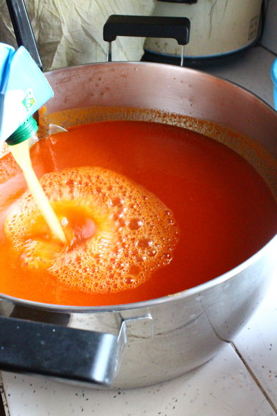 • หลังจากต้มเสร็จแล้ว เติมน้ำตาลทรายลงไปเล็กน้อย แล้วก็เติมน้ำเสาวรสลงไปครับ ผมจะใช้อัตราส่วน ฟักข้าว 1 ลูก ต่อ น้ำเสาวรส 1 ลิตร สำหรับท่านที่ชอบทานเปรี้ยวไม่ต้องเติมน้ำตาลทรายก็ได้ แต่ผมว่าเติมเล็กน้อยจะได้รสที่กลมกล่อมกว่าครับ เมื่อเติมน้ำเสาวรสแล้วก็นำใส่ภาชนะที่จะแช่เย็นได้เลยครับ