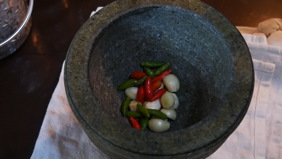 1.โขลกพริก กระเทียม และกะปิเข้าด้วยกัน