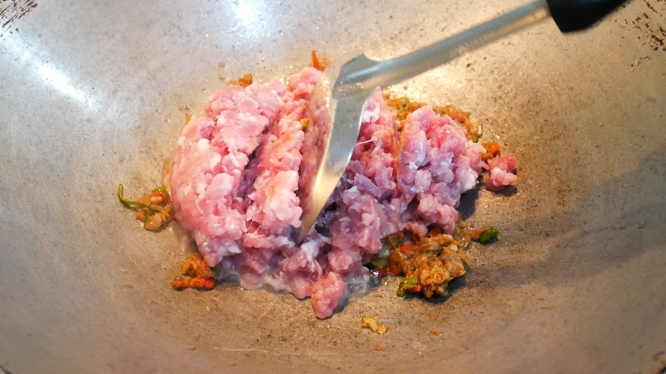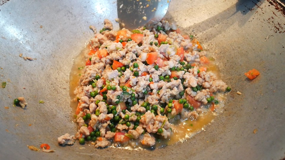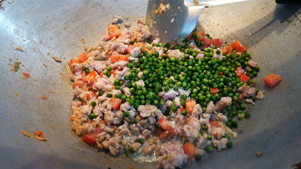 2. ตั้งกะทะใส่น้ำมัน หลังจากนั้นนำพริกที่โขลกไว้ ใส่ลงไปผัดจนมีกลิ่นหอม ใส่หมูสับ ผัดจนหมูเกือบสุก ใส่มะเขือเทศ ผัดต่อ ใส่เม็ดพริกไทยอ่อน ปรุงรส สำหรับรสชาติ และความเผ็ด สามารถปรับได้ตามรสชาติของแต่ละบ้านได้เลยค่ะ โดยปกติจะมีรสเปรี้ยวนำแต่ไม่มากค่ะ