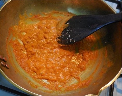 -ใส่หัวกระทิ ลงไป รอให้เดือด ใส่น้ำมะกรูด และใบมะกรูดลงไป คนให้เข้ากัน แล้วยกลงจากเตา