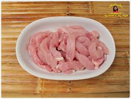 -นำหมูมาเลาะพังผืดออกแล้วหั่นแฉลบขวางบางๆ