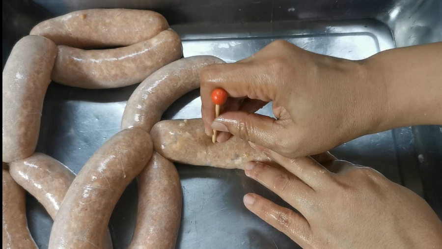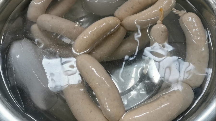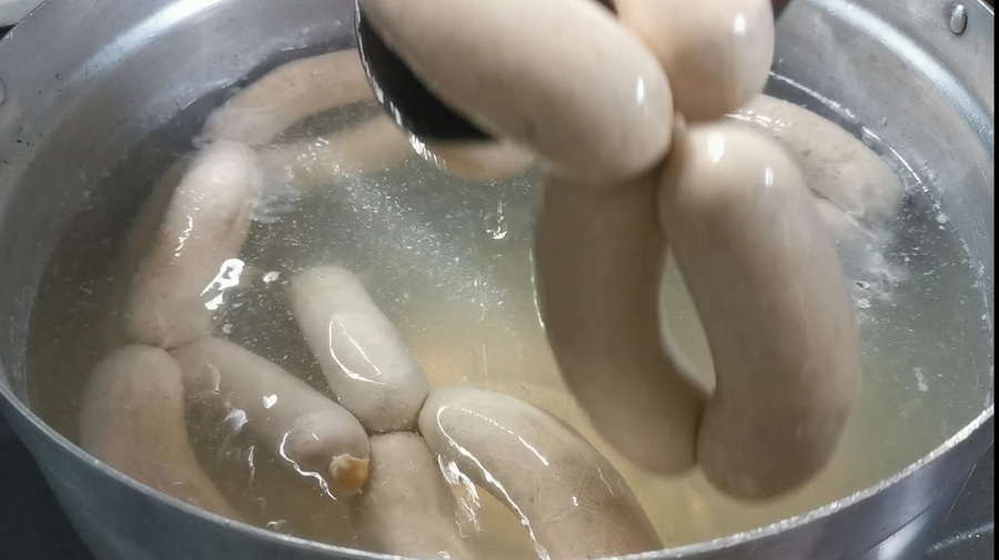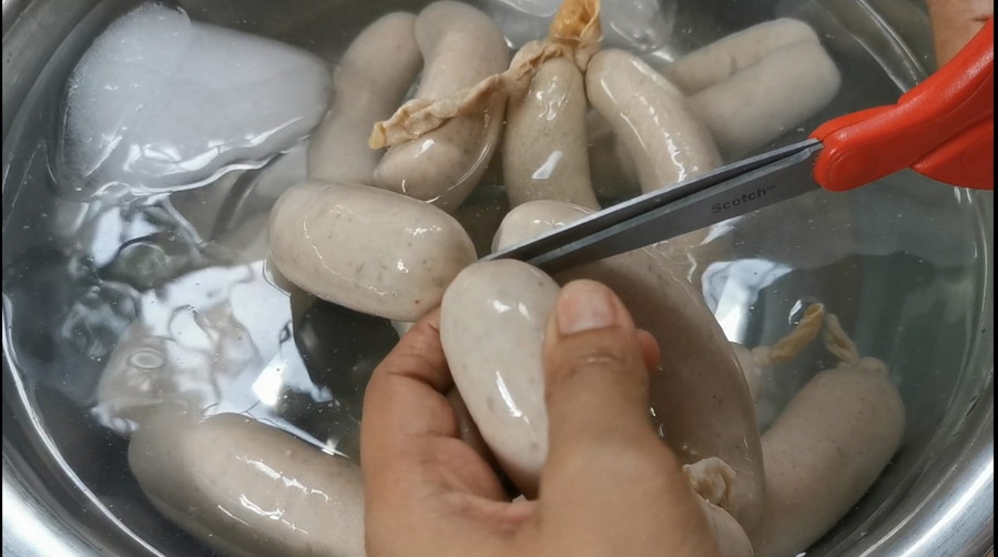 5. ตั้งน้ำให้ร้อนแต่ไม่เดือด ใส่ไส้กรอกลงไปต้ม 30 นาที ตักขึ้นใส่ลงในน้ำเย็นจัด