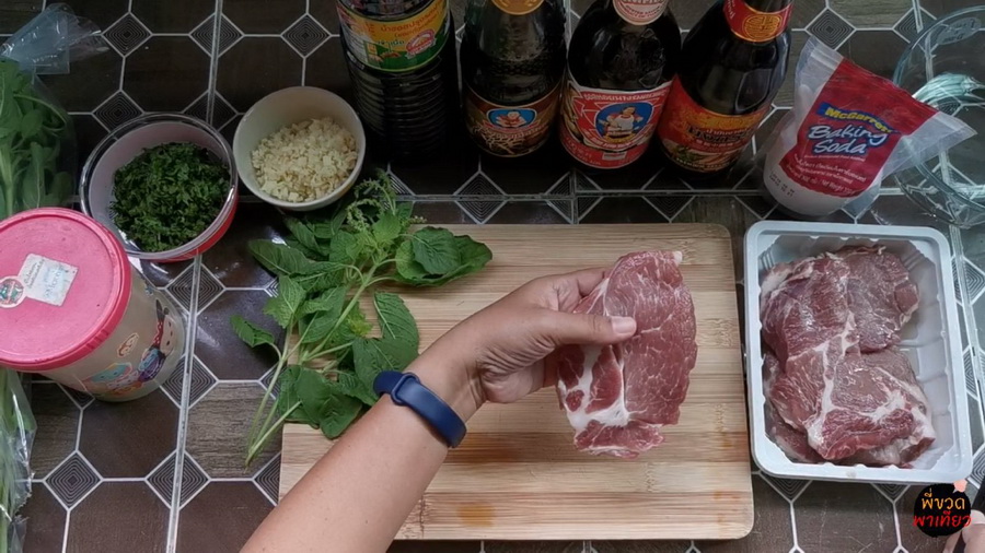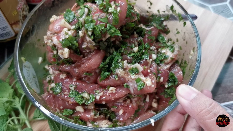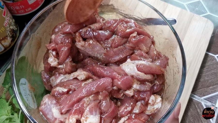 1. นำสันคอหมูมาหั่นเป็นเส้น ๆ