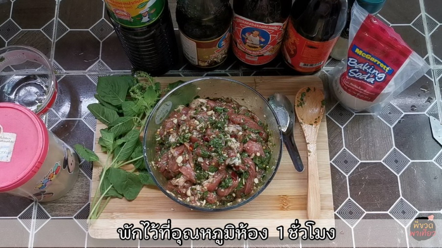 2. จากนั้นผสม เบคกิ้งโซดา ซอสปรุงรส ซีอิ้วขาว ซอสหอยนางรม น้ำตาลทราย น้ำมันงา ผสมคลุกเคล้าให้เข้ากัน