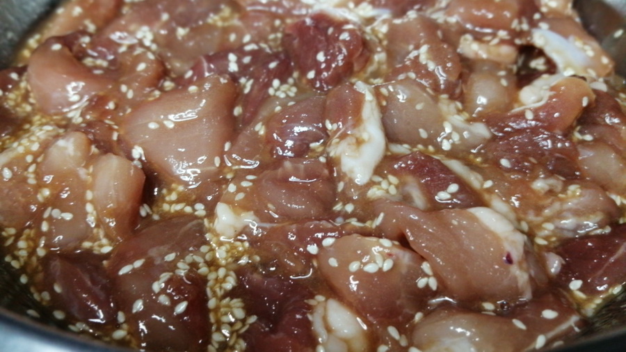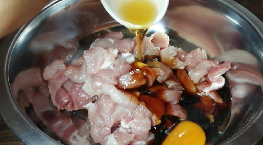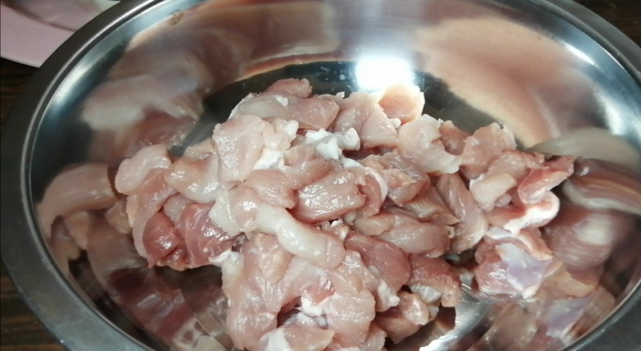 1. หั่นหมูเป็นชิ้น ใช้หมูเนื้อแดงติดมัน อย่าให้หมูของเราหนาเกินนะ หั่นบาง ๆ พอ